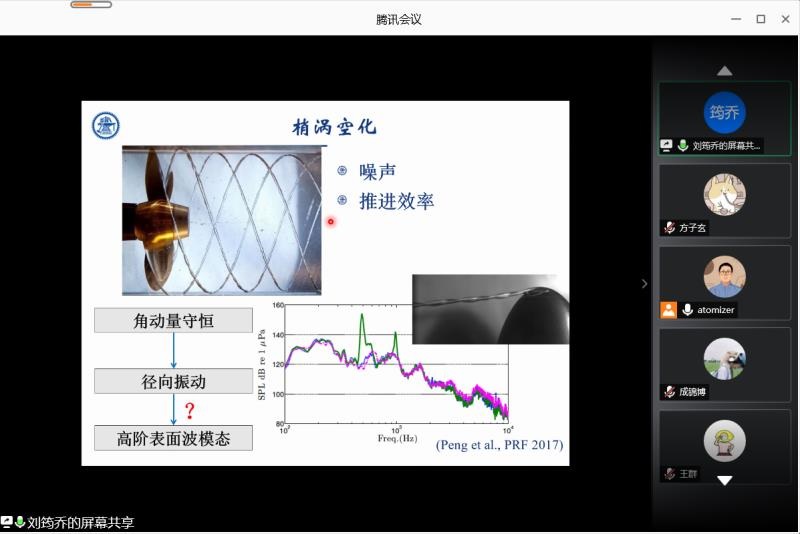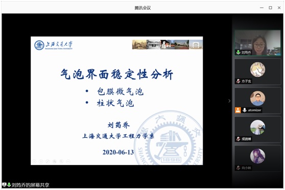2020年6月13日晚,北航宇航学院喷雾燃烧实验室迎来第六期线上云讲座。本期讲座我们有幸邀请到了上海交通大学船舶海洋与建筑工程学院,工程力学系的刘筠乔副教授为大家介绍包膜微气泡界面稳定性分析的相关课题。北航宇航学院喷雾燃烧实验室富庆飞教授,李敬轩教授,刘虎、宋艳博士后以及团队内全体硕博研究生出席本次讲座。