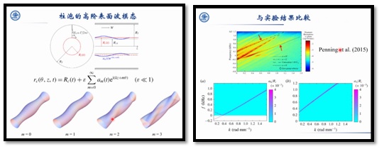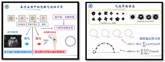 第一部分内容刘老师从医学中的包膜气泡应用入手,为我们介绍了多种多样的气泡界面模态,振荡电场、超声波场中单个气泡形状模态的演化与参数不稳定分析,考虑非线性径向振动、弱粘性、变形等因素的双气泡动力学等内容。