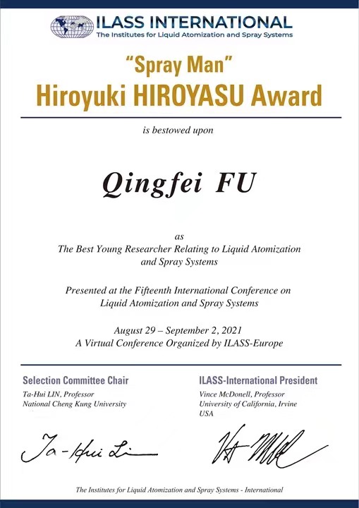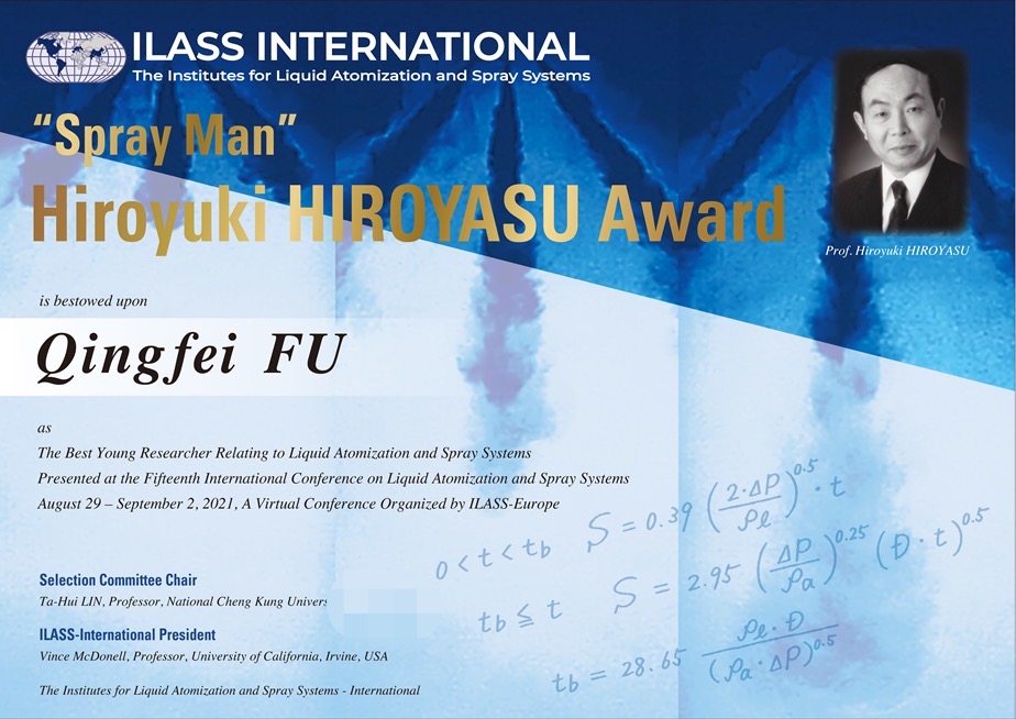 在刚刚结束的ICLASS-2021(International Conference on Liquid Atomization and Spray Syetems)上,富庆飞教授荣获首次设立的Hiroyasu Award(广安博之奖)。该奖项是国际液体雾化与喷雾系统学会(ILASS)首次设立,面向全球四十岁以下在液体雾化及喷雾学术领域的卓越青年学者,每三年评选一次,每次全球评选出1人。富庆飞教授经过中国国内初评、亚洲区评选以及最后的国际评审,最终脱颖而出,获得了首届Hiroyasu Award。该奖项被命名为Hiroyasu Award(广安博之奖),是为了纪念在内燃机喷雾领域做出重要贡献的日本学者广安博之教授。