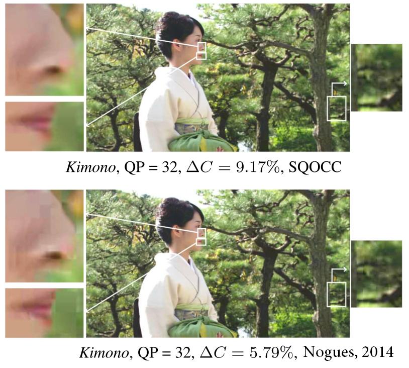 Fig. 7 shows one selected frame of Kimono at QP = 32, decoded by HM 16.0 with our approach and the conventional Nogues' approach. Clearly, our approach produces higher visual quality in face regions than Nogues', even when the complexity reduction is much more in our approach. Besides, the non-ROI background is with low quality in our approach, as there exist obvious blocky effects. This also indicates that our approach is capable of optimizing subjective quality by maintaining high quality in ROIs at the expense of low quality in non-ROIs.