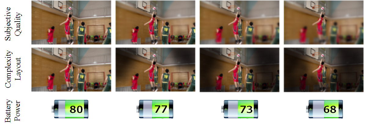 Fig. 1 shows an example for application of our SQOCC approach. When the devices is with sufficient power (eg. 80%), the video can be decoded with full fidelity. Once the battery is insufficient (eg. 77%, 73% and 68%), the video is decoded with low complexity (complexity is reduced in the dark areas), according to the left battery. However, it incurs the quality degradation. The subjective quality should be maximized in quality degradation for the proper Quality of Experience (QoE), according to Region-of-Interests (ROI).