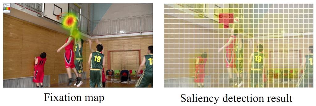 ) in HEVC compressed domain: bit allocation and the contrast of bit allocation with its neighbors. Fig. 2 shows an example of our saliency detection method, and it can be seen that the detected result is tally with the saliency grountruth (from eye-tracking experiment) well.
